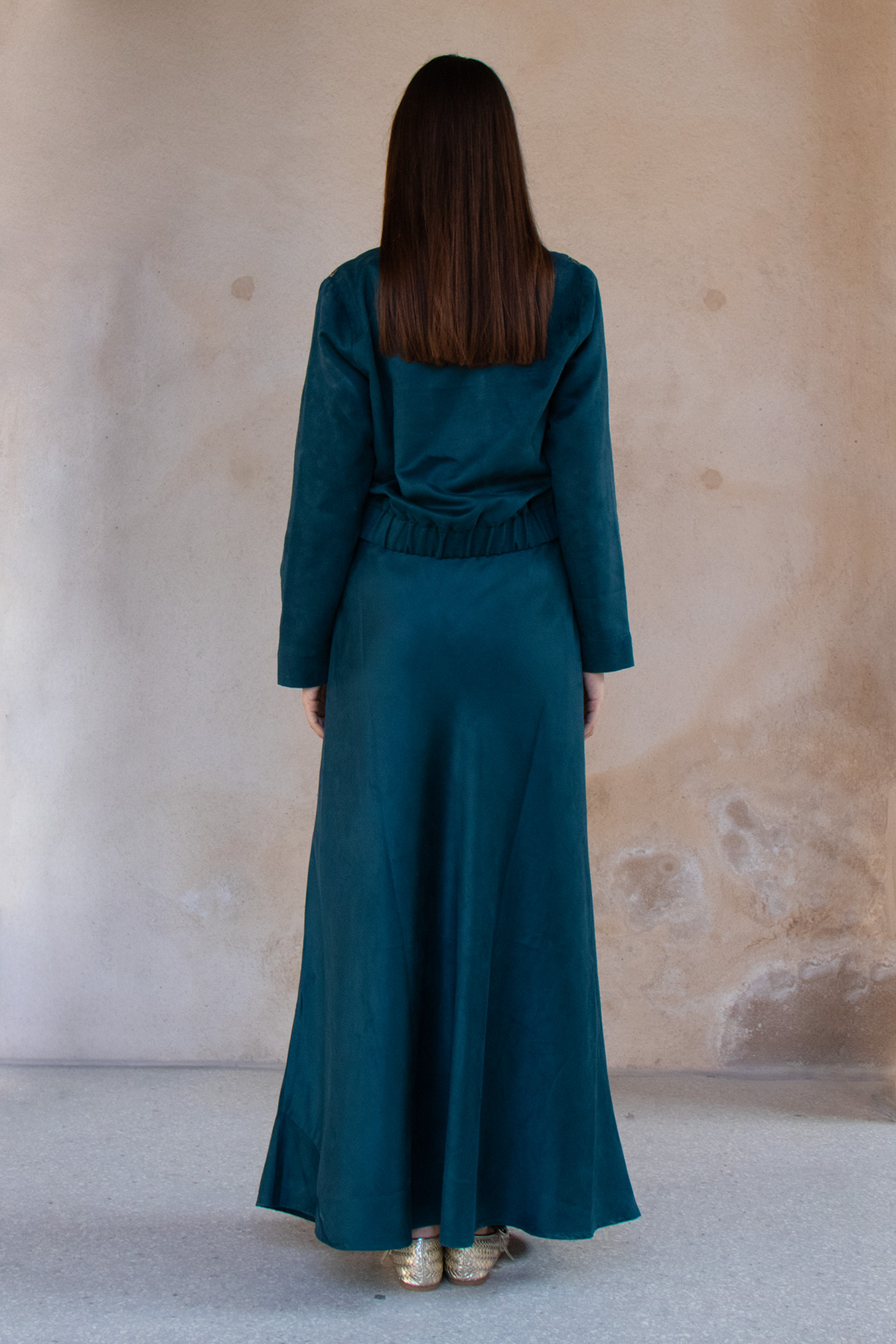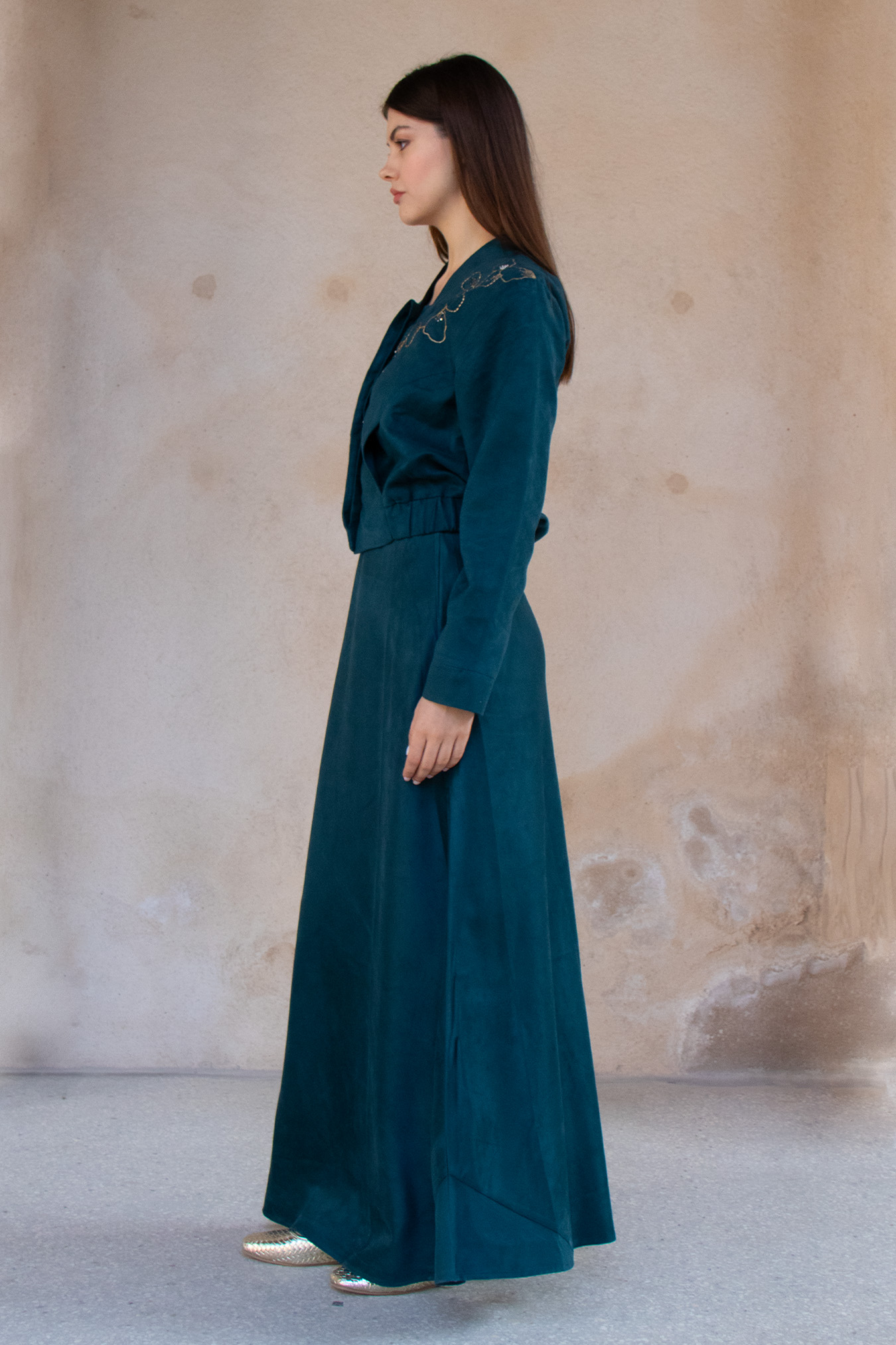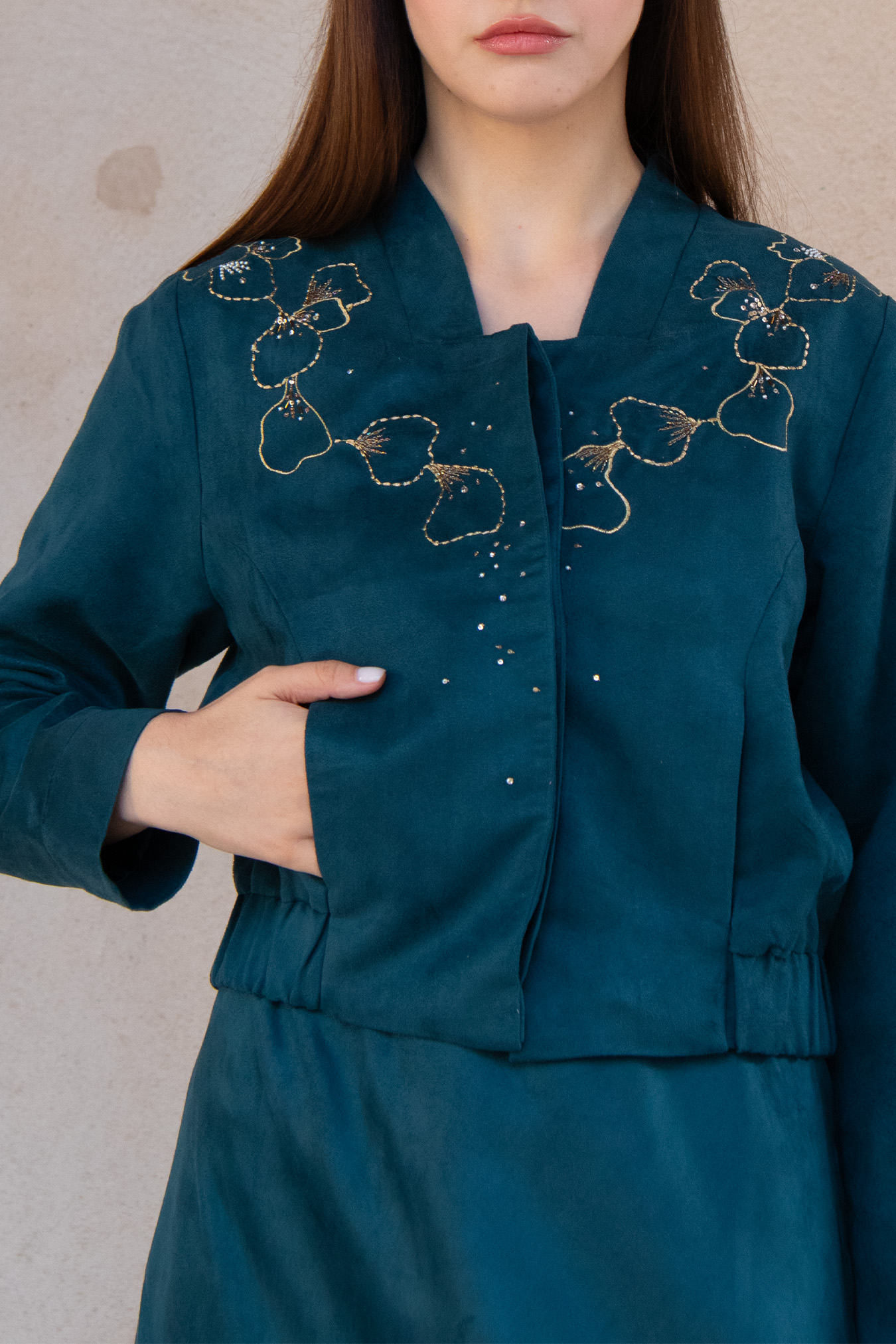 Faux suede bomber and skirt set featuring hand-embellished details.