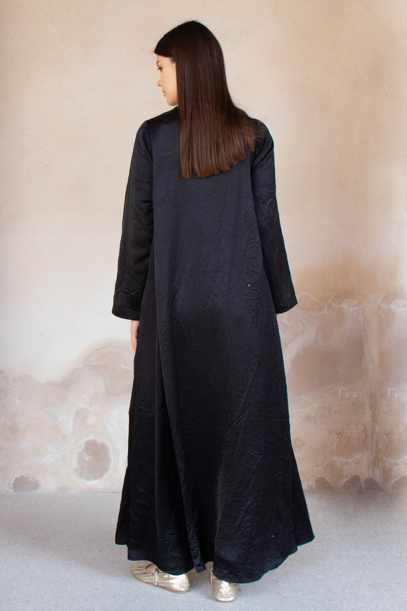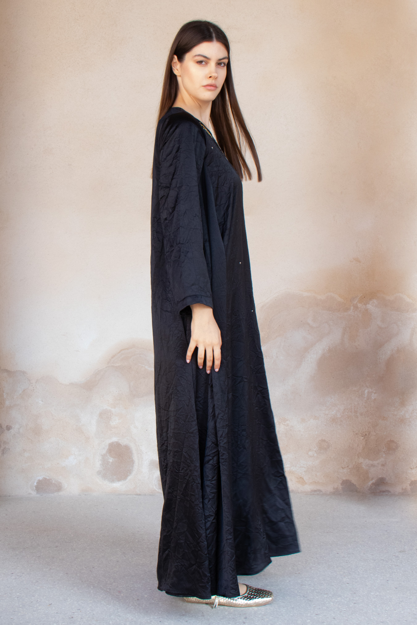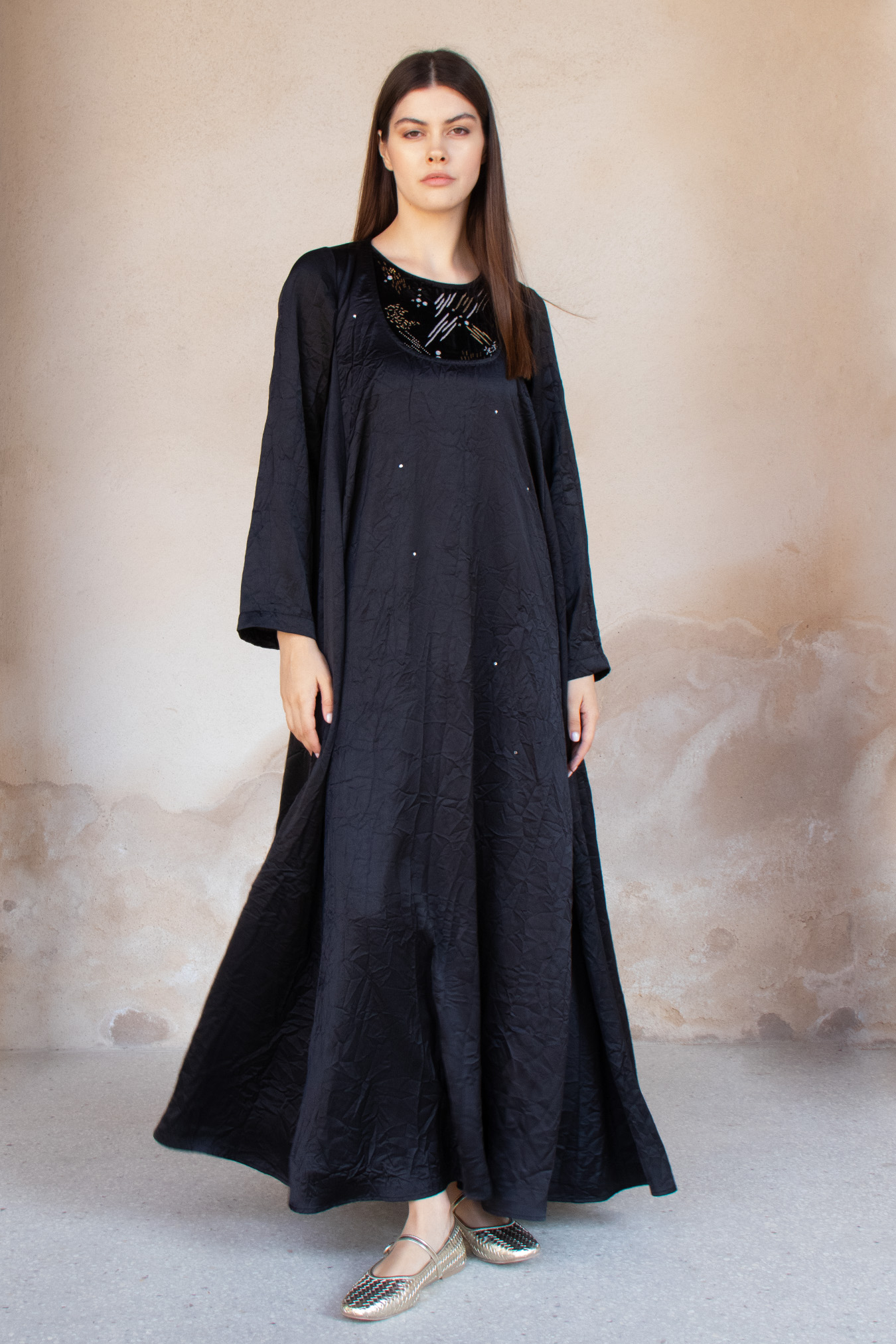 Two-piece kaftan set featuring an embroidered velvet inner dress and hand-embellished satin outer layer.