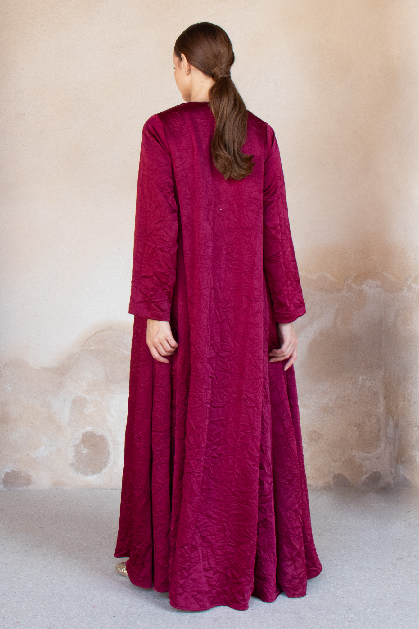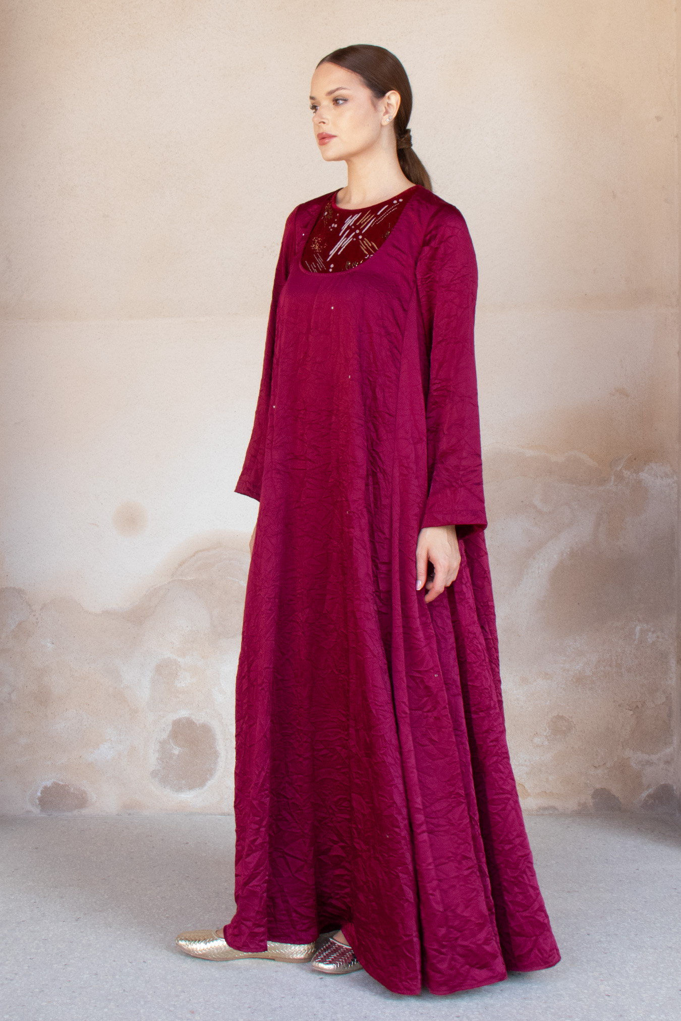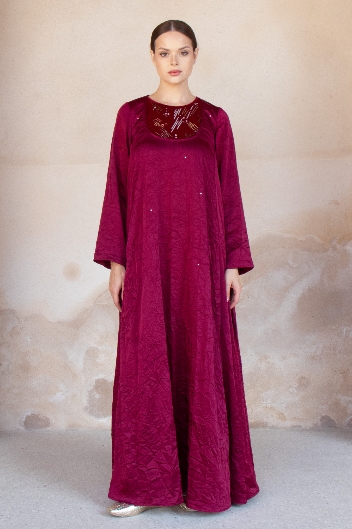 Two-piece kaftan set featuring an embroidered velvet inner dress and hand-embellished satin outer layer.