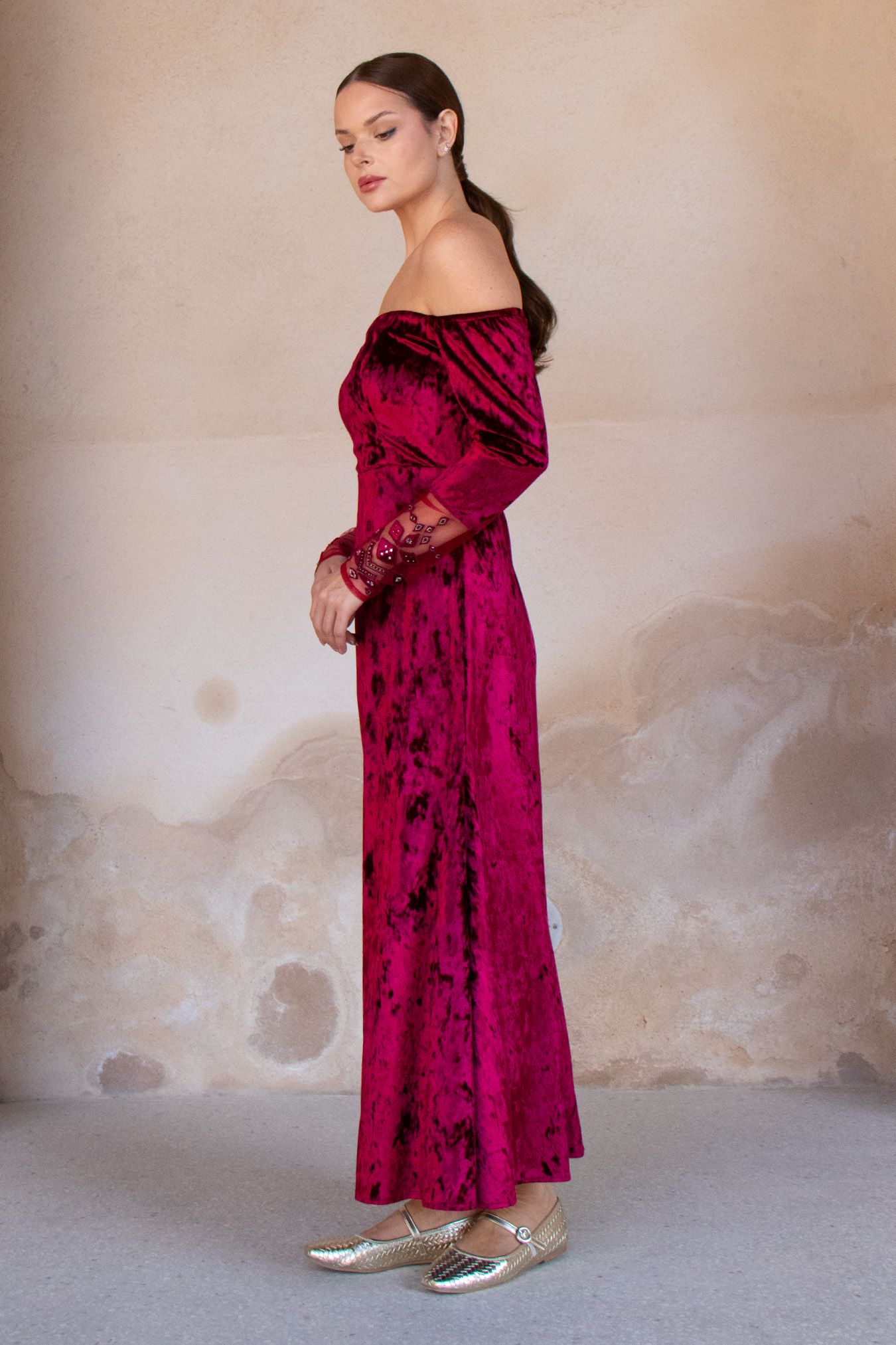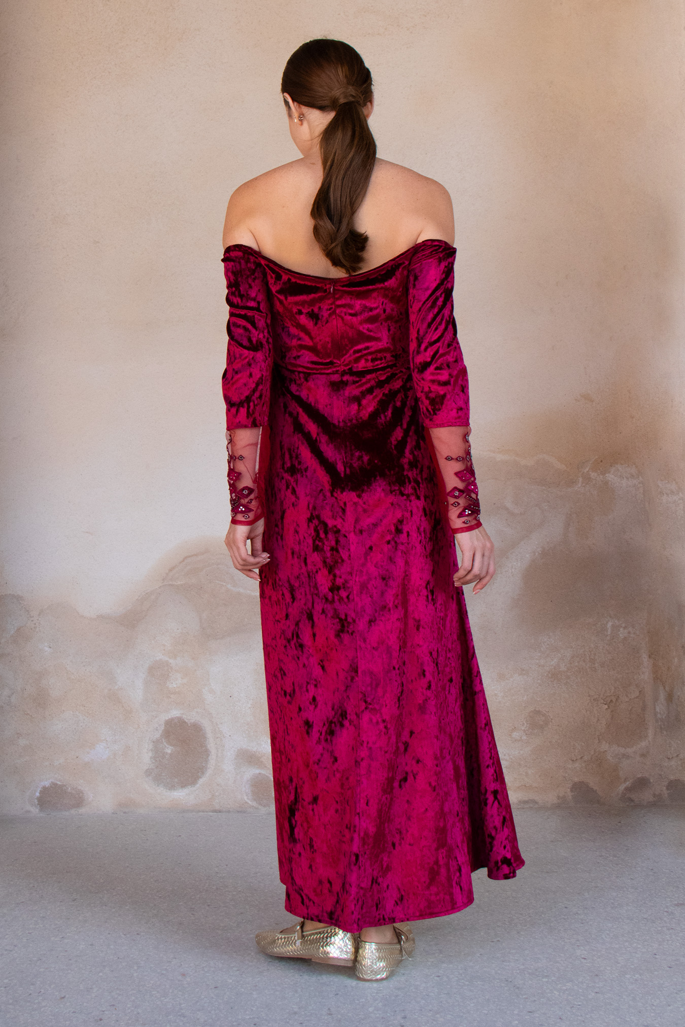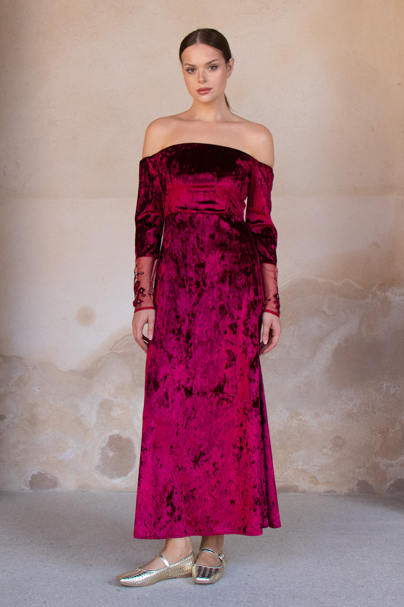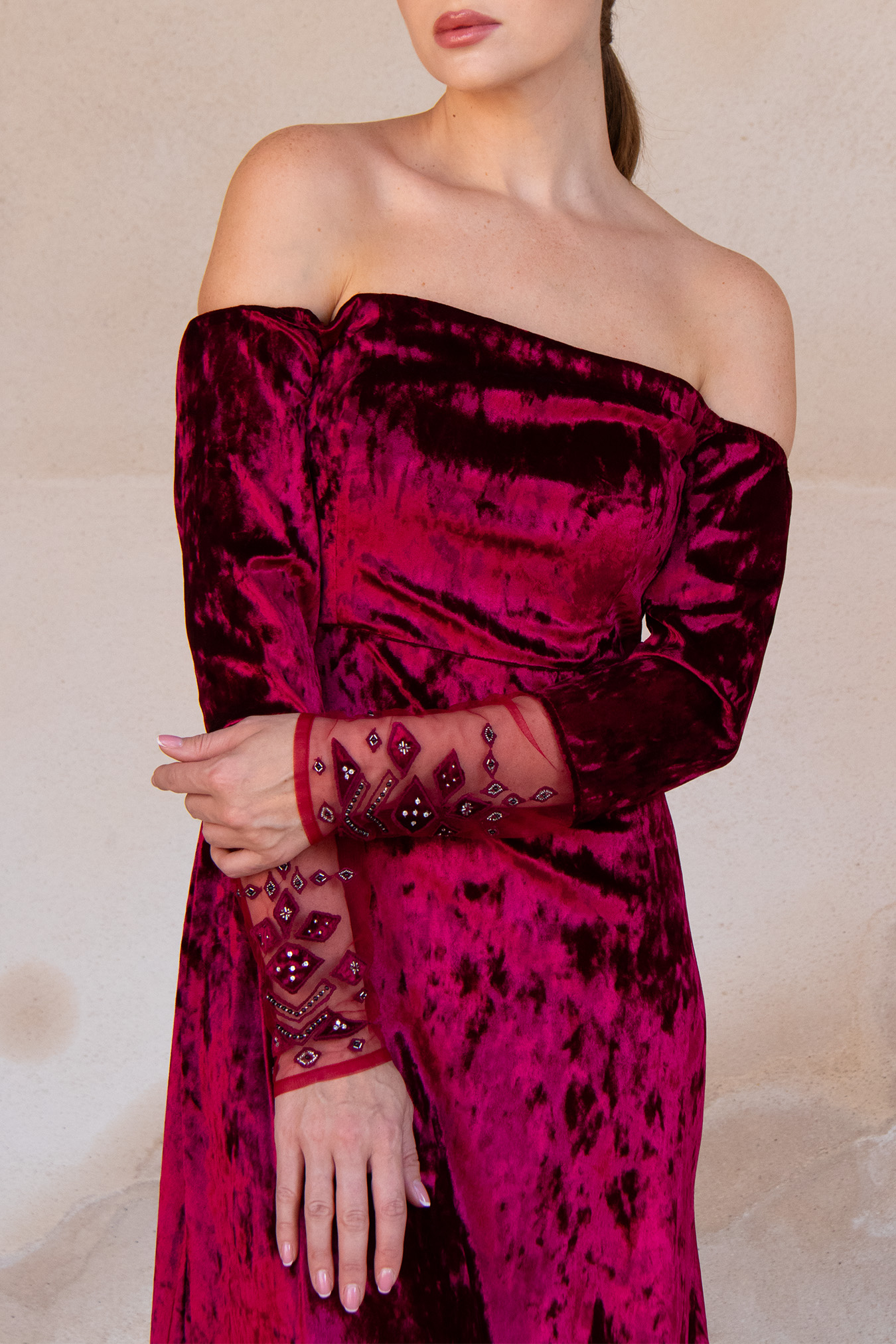 Off-the-shoulder velvet dress with delicate hand-embroidered mesh sleeves.